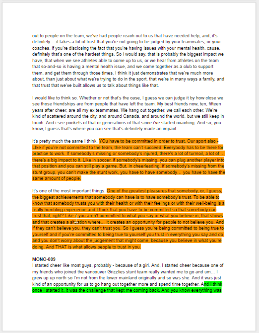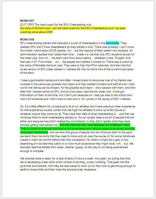 As the main liason between the cheerleading team and the documentary crew, I met with SFU Cheer’s head coach, Richard, to discuss the possibility of filming them. I presented our treatment to ensure he had a clear idea of what we would like to do. With his approval, I created and collected consent forms for the entire team. I then begun considering questions for the interview.