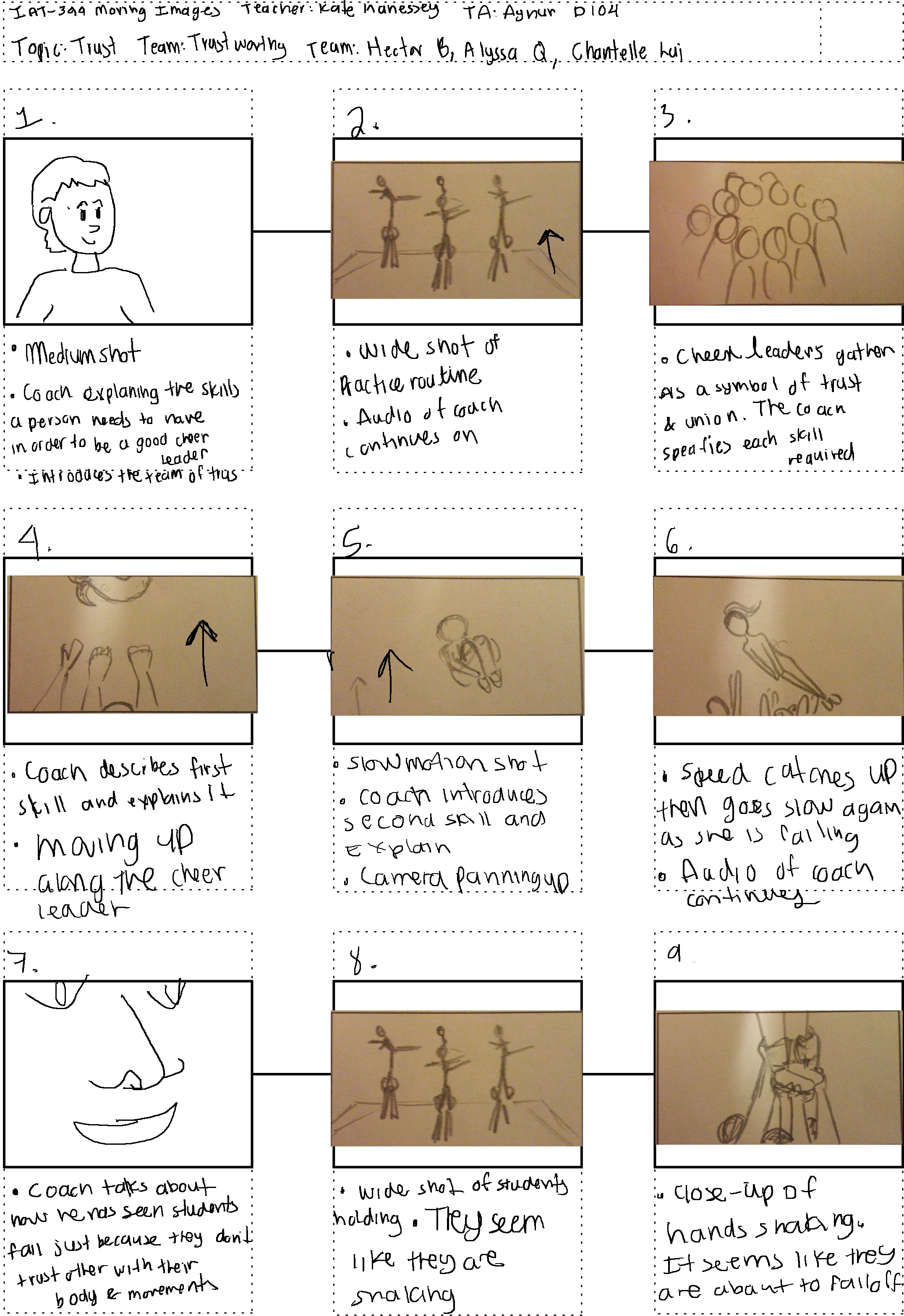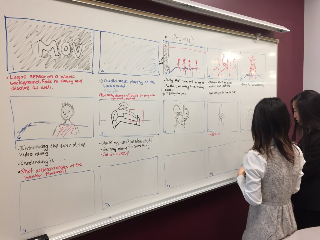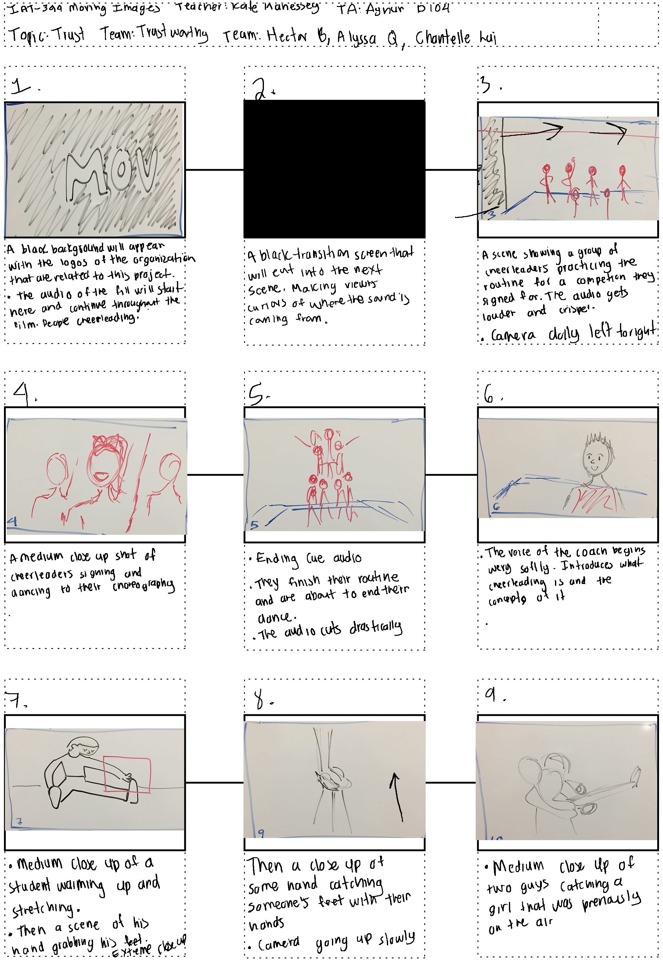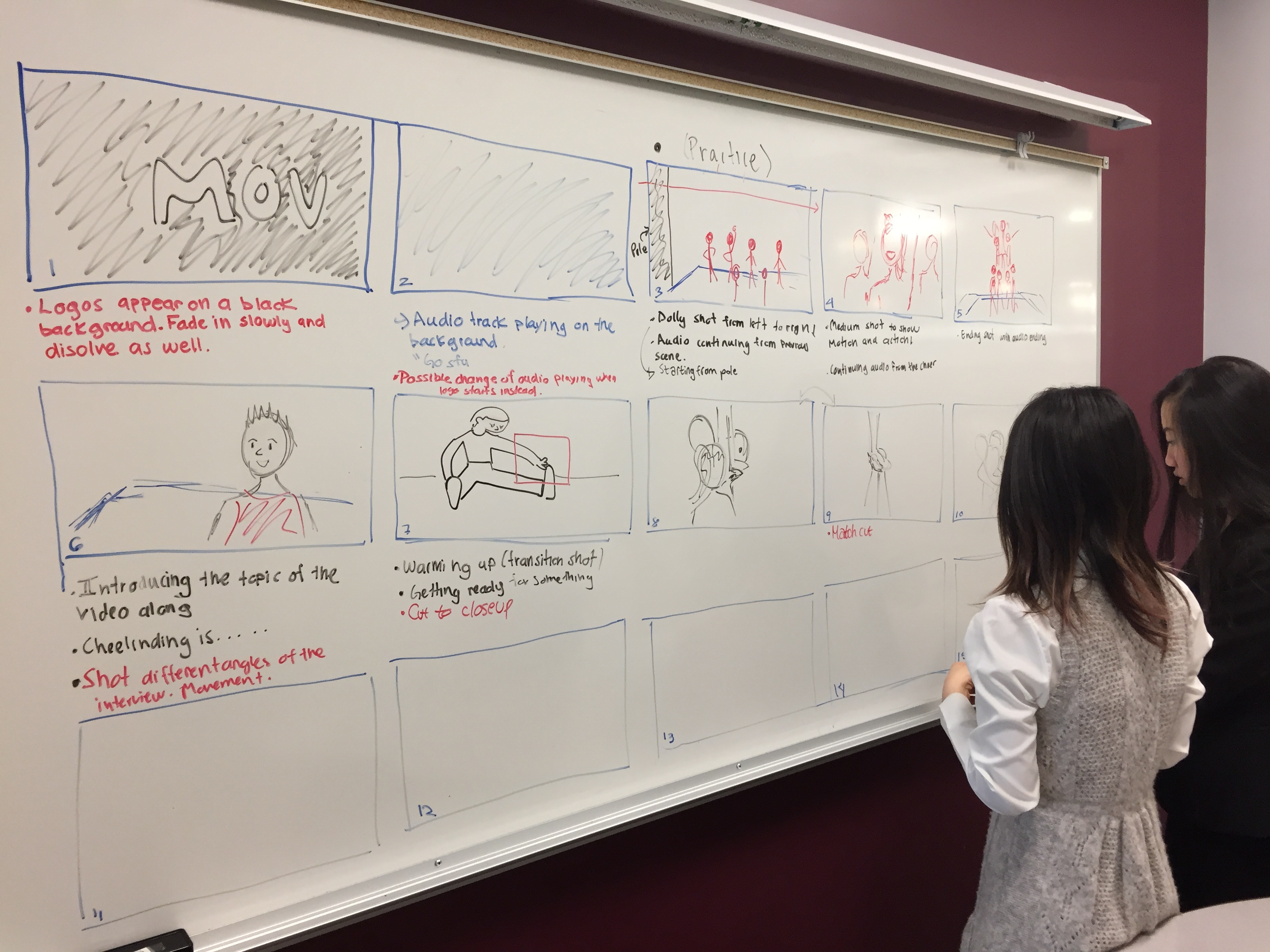 I took some photos around the gym to get a sense of the space. My film team and I then created a storyboard based of off these photos, my knowledge of the cheer team’s routine, and our ideal narrative.